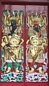 1st Month, 1st Day | Chinese Lunar New Year | Chinese celebrate the 1st day of Chinese New Year Traditionally (in the past) the picture of the two door gods are pasted on doors:- . General Qin Shu Bao and General Yuchi Jingde of the early Tang Dynasty. Both Generals hold golden axes in their hands and held a sword, bow and arrows on their waist. Some people instead prefer to write their names on the doors instead of hanging their pictures. Make offerings (food) and offer incense to ancestors. Traditionally Fire crackers were let off to drive away evil and illnesses. Chinese couples and their children would visit relatives especially their parents and elders and present them with two mandarin oranges and a `Red packet' or Ang Pow. |